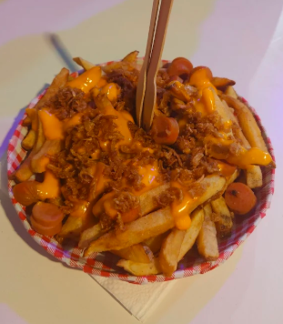 Poutine : 150 g de frites fraiches, cheddar, oignons frits, saucisse.