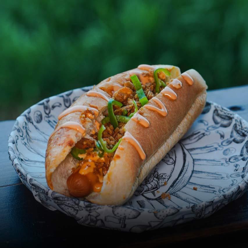 Slam Dog : Un pain frais du boulanger, une saucisse de porc 100% française, de bons cornichons, des oignons frits agrémentés de moutarde au miel et ketchup.